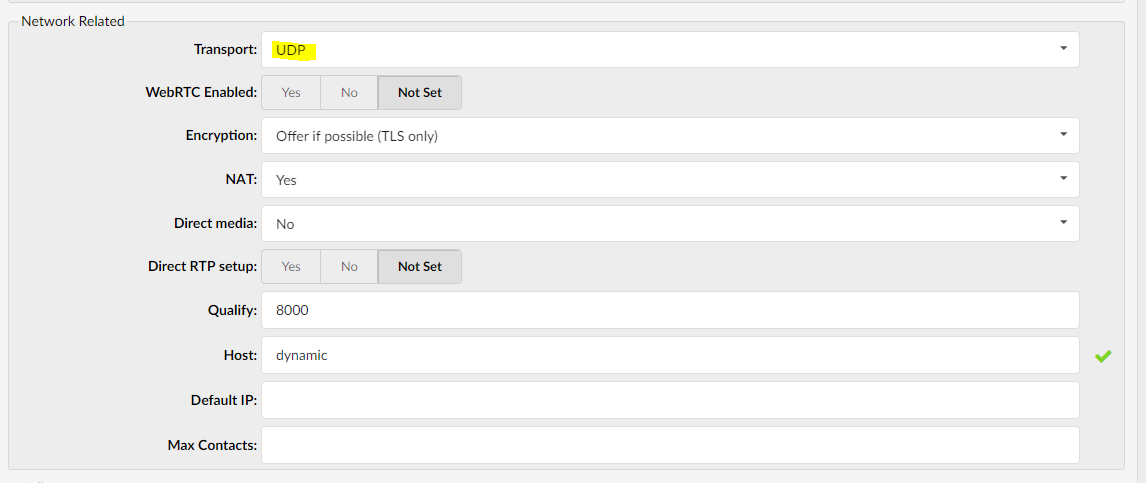 To use system Hot Desking the extension must have UDP selected as the transport in the “Network related” settings under the extensions advanced options