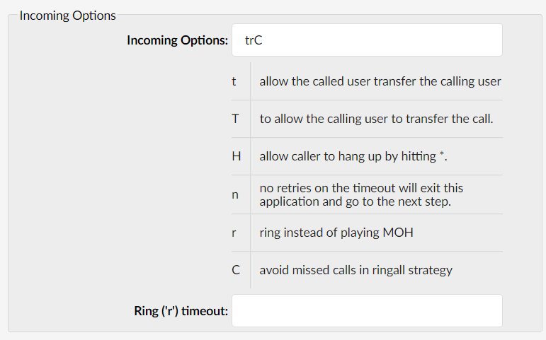 Dial Options are additional Pre-fixes that can be assigned to extensions such as Ring groups and Queues to effect how the calls are processed.