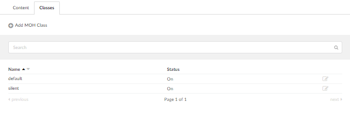 MOH classes are similar to folders on a computer which are filled with music files. Once an MOH class is assigned to the queue, for example, all sound files that belong to ‘default’ class are played back in random order. MOH classes are listed here with the following details.