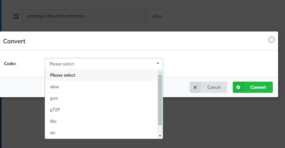 (ex. Select a box next to a sound file (e.g. greeting-conference). Select a codec from the drop down menu and click on Convert. The sound file will be converted to that codec).